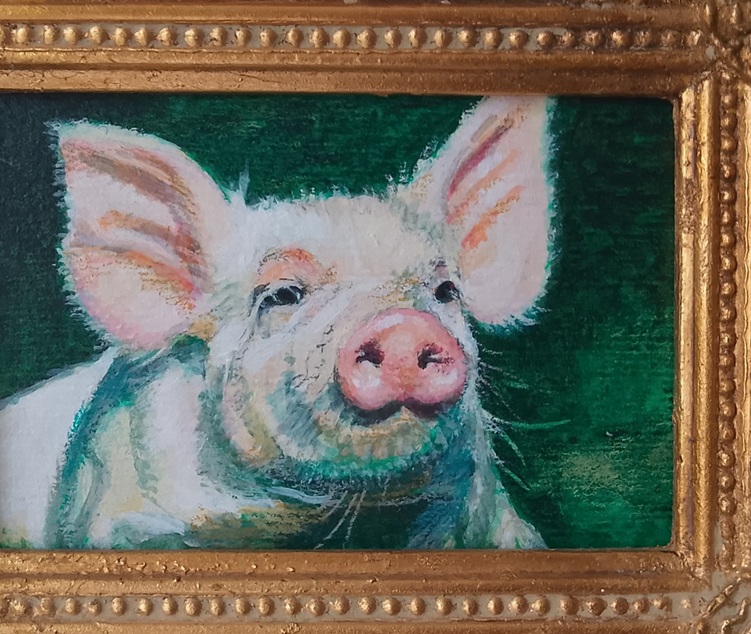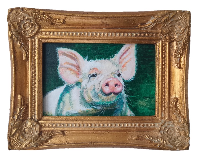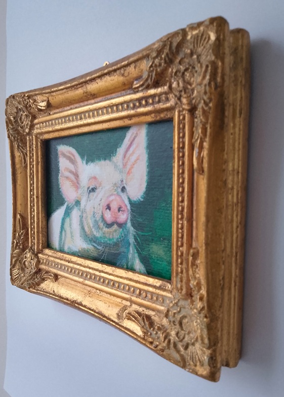 Biggetje kunstwerk. De schilderijen van artist Liesbet Milort brengen je terug naar de natuur. Haar kunstwerken geven de dieren en de natuur die Nederland rijk is een krachtige en bijzondere uitstraling. Milort combineert prachtige verfkleuren met een fantastisch gevoel voor licht en schaduw werking, waardoor haar werk een magisch realistische dimensie krijgt. Deze unieke mix en kleuren zorgt voor een intieme en betoverende beleving van de natuur in haar schilderijen. Materiaal; acryl en krijt in vintage lijst. Afmetingen: 18 x 13 cm. Levertijd: 1 a 3 werkdagen.